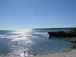 Não há rios, córregos, lagos ou quaisquer cursos d'água na ilha, pois a água se infiltra rapidamente em suas rochas porosas formando diversas rachaduras e cavidades no substrato. Após infiltrarem e percolarem pelas rochas, as águas se acumulam em um lençol freático localizado a cerca de 60 metros abaixo da superfície e posteriormente afloram em fontes nas escarpas próximas ao mar[2]. Há muitas cavernas no interior da ilha, sendo que algumas apresentam bolsões de água doce em seu interior, consistindo em importante fonte de recursos hídricos para os habitantes locais[2].