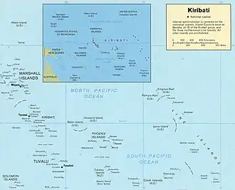 A República de Quiribáti, pertencente à Commonwealth, consiste num conjunto de 33 atóis de coral, agrupados em três grupos de ilhas, no centro do oceano Pacífico. De oeste para este existe o grupo das ilhas Gilbert (17), as ilhas Fênix (8) e as ilhas da Linha (8), excluindo três da parte norte deste grupo que são território dos Estados Unidos.