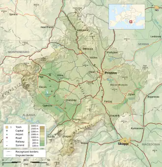 A maior parte do terreno kosovar é montanhoso, e o pico mais alto do país é o Ðeravica, com 2 656 metros. O país tem duas regiões principais planas, a bacia de Metohija, localizada na parte ocidental do Kosovo, e a planície do Kosovo, que ocupa a parte oriental. Os principais rios da região são o Drin Branco, que desagua no mar Adriático, o Erenik, um de seus afluentes, o Sitnica, o Morava do Sul, a região de Goljak, e o Ibar, no norte. Os maiores lagos são o Gazivoda, o Radonjić, o Batlava e o Badovac.