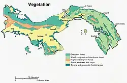 A vegetação do Panamá caracteriza-se basicamente pela floresta tropical perene pela qual são cobertos 60% da extensão territorial do país. É a vegetação original das regiões na qual chove mais de 2 000 mm o ano inteiro, não ocorrendo estação seca: baixadas litorâneas caribenhas, morros e sopés até mais de 2 200 m de altitude. Dentre as espécies dessa floresta são encontrados o pau-brasil, jacarandá, cedro, etc. Na floresta com altitude superior de 2 200 m, onde existem outras espécies, é adquirido um caráter decíduo. Nas planícies, morros e sopés da vertente pacífica, a vegetação original é de savanas que intercalam-se com florestas tropicais semi-decíduas, Nos dois litorais, ocorrem mangues e florestas onde há uma série de palmeiras e coqueiros.[1]