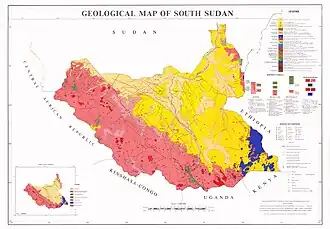 A parte sudoeste do país tem afloramentos do substrato, constituído por rochas magmáticas. Na fronteira com a Etiópia há afloramentos de rochas magmáticas e intrusivas.