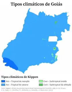 O clima predominante em Goiás é o tropical com estação seca (Aw na classificação de Köppen-Geiger), com as temperaturas médias anuais variando de 23°C a 24°C ao norte, e 20°C a 21°C ao sul. A precipitação média anual atinge 1800 mm no oeste e vai diminuindo conforme vai para o leste para 1500 mm/ano. As chuvas estão bastante concentradas entre outubro e abril.[20][39][40] O clima tropical de altitude é registrado em regiões mais elevadas do estado, sobretudo na região de Anápolis e do entorno do Distrito Federal. As temperaturas são mais amenas quando comparadas com o tropical com estação seca, mas o regime pluvial é muito parecido.[20]