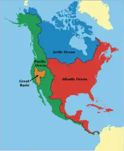 A Grande Bacia destacada em laranja e outras bacias na América do Norte e América Central.Distintas definições da Grande Bacia