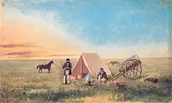 Nos séculos seguintes, o negócio das peles trouxe milhares de europeus às Grandes Planícies, caçadores de peles franceses, espanhóis, britânicos, russos e dos jovens Estados Unidos percorreram parte da região. Com a compra da Luisiana[22] em 1803 e a subsequente Expedição de Lewis e Clark[23] em 1804, as Grandes Planícies tornaram-se mais acessíveis. Um centro importante de venda de peles foi instalado em Fort Lisa[24] à beira do rio Missouri[3] no Nebraska, tendo estas primeiras implantações aberto a porta para uma vasta expansão para o oeste, com povoações em breve cobrindo a totalidade das Grandes Planícies.