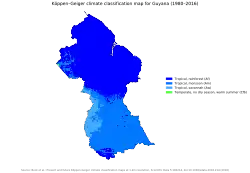 A precipitação é maior no noroeste e mais baixa no sudeste e interior. A costa média perto da fronteira com a Venezuela é de cerca de 250 centímetros, mais a leste, em Nova Amsterdã, 200 centímetros, e no mar Rupununi, no sul da Guiana, 150 centímetros. As áreas no lado nordeste das montanhas, expostas a rajadas de vento, podem receber uma quantidade de precipitação de 350 centímetros por ano. A chuva ocorre durante todo o ano, mas cerca de 50% da precipitação anual cai durante a estação chuvosa do verão de maio a julho, ao longo da costa e de abril a setembro, no interior. As áreas costeiras têm um período chuvoso adicional entre novembro e janeiro. A chuva geralmente cai à tarde ou durante tempestades. Os dias com muito vento são incomuns, a maioria dos dias tem entre quatro e oito horas de sol entre manhã e tarde.[40]