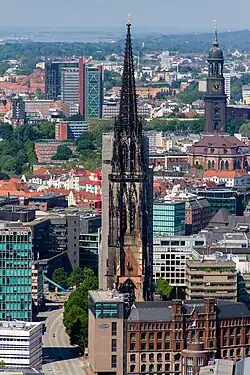 A prefeitura é um edifício neo-renascentista ricamente decorado e concluído em 1896. Com sua torre de 112 metros de altura, é o mais alto edifício-sede de prefeitura da Europa. Em sua fachada há imagens dos imperadores do Sacro Império Romano-Germânico, pois Hamburgo, como Cidade Livre Imperial, esteve sob sua soberania.[38] O edifício Chilehaus, de 1922 tem a forma de um navio transatlântico, e foi desenhado pelo arquiteto Fritz Höger.
