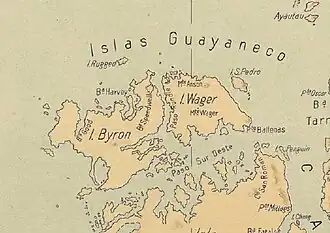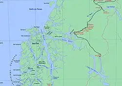 ![]() Mapa da Patagônia chilena (latitudes 47°S a 49°S). A Ilha Wager forma o término noroeste do Canal Messier [en], enquanto a Península Larenas forma o término nordeste. | |
