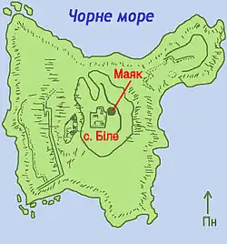 O ponto da costa mais próximo é a ilha Kubanskyi, localizada na parte ucraniana do delta do Danúbio, entre o canal Bystroe e o canal Vostochnoe. A cidade mais próxima é Sulina, na Roménia, a 45 km de distância.