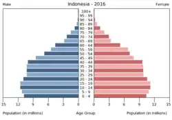 De acordo com o censo nacional de 2010, a população da Indonésia é de 237,6 milhões de habitantes,[79] com um crescimento demográfico de 1,9% ao ano.[80] Aproximadamente 60% da população vive em Java,[79] a ilha mais populosa do mundo.[57] Em 1961, o primeiro censo pós-colonial registrou uma população total de 97 milhões de pessoas.[81] Apesar de um programa de planejamento familiar bastante eficaz, que está em vigor desde os anos 1960, a população indonésia deverá crescer para cerca de 265 milhões em 2020 e 306 milhões em 2050.[82]