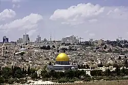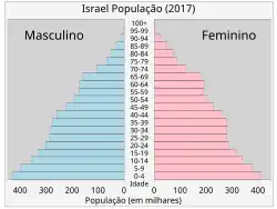 O centro financeiro de Israel é Telavive,[34] enquanto Jerusalém é a cidade mais populosa do país e sua capital[nota 8] (embora não seja reconhecida como tal pela comunidade internacional). A população israelense, conforme definido pelo Escritório Central de Estatísticas de Israel, foi estimada em 2024 em 9,8 milhões de pessoas, das quais 7,1 milhões eram judias. Os árabes formam a segunda maior etnia do país, com 2 milhões de pessoas e outras etnias somam 558 600 pessoas.[35] A grande maioria dos árabes israelenses são muçulmanos, além de uma população menor, mas significativa de beduínos do Negueve e os cristãos árabes. Outras minorias incluem várias denominações étnicas e etno-religiosas, como os drusos, circassianos, samaritanos, israelitas hebreus negros, maronitas, além de outros.