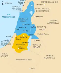 A Terra de Israel, conhecida em hebraico como Eretz Israel, é sagrada para o povo judeu desde os tempos bíblicos. De acordo com a Torá, a Terra de Israel foi prometida aos três patriarcas do povo judeu, por Deus, como a sua pátria;[50][51] estudiosos têm colocado este período no início do 2º milênio a.C..[52] A terra de Israel guarda um lugar especial nas obrigações religiosas judaicas, englobando os mais importantes locais do judaísmo (como os restos do Primeiro e Segundo Templos do povo judeu). A partir do século X a.C.[53] uma série de reinos e estados judaicos estabeleceram um controle intermitente sobre a região que durou cerca de 150 anos, para o Reino de Israel, até à sua conquista pelos assírios em 721 a.C., e quatro séculos para o Reino de Judá, até à sua conquista por Nabucodonosor II em 586 a.C. e destruição do Templo de Salomão pelos babilónios.[54] Em 140 a.C. a revolta dos Macabeus levou ao estabelecimento do Reino Hasmoneu de Israel, cuja existência enquanto reino independente durou 77 anos, até à conquista de Jerusalém por Pompeu em 63 a.C., altura em que se tornou um reino tributário do Império Romano.[55]