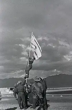 Em 14 de maio de 1948, um dia antes do fim do Mandato Britânico, a Agência Judaica proclamou a independência, nomeando o país de Israel. No dia seguinte, cinco países da Liga Árabe, Egito, Síria, Jordânia, Líbano e Iraque, apoiados pela Arábia Saudita e pelo Iêmen, invadiram[88] o território do antigo Mandato Britânico da Palestina, iniciando a Guerra árabe-israelense de 1948.[89] Marrocos, Sudão, Iêmen e Arábia Saudita também enviaram tropas para ajudar os invasores. Após um ano de combates, um cessar-fogo foi declarado e uma fronteira temporária, conhecida como Linha Verde, foi estabelecida. Os territórios anexados da Jordânia tornaram-se conhecidos como Cisjordânia e Jerusalém Oriental, o Egito assumiu o controle da Faixa de Gaza.