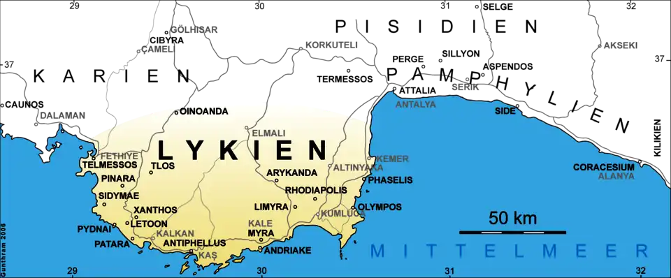 As fontes antigas mencionam por volta de setenta povoações na Lícia. Elas estavam todas ou ao longo da faixa costeira em enseadas protegidas ou nas encostas e colinas das cadeias montanhosas. Elas são geralmente de difícil acesso, o que, na Antiguidade, era uma característica defensiva. A costa recortada favorecia a construção de portos bem defendidos de onde, em tempos difíceis, partiam as frotas piratas da Lícia.