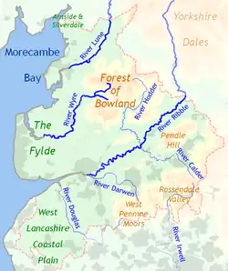 Os rios de Lancashire correm em sentido oeste, dos Peninos para Mar da Irlanda. Estes rios incluem o Wyre e o Lune. Seus afluentes são os rios Calder, Darwen, Douglas, Hodder e o Yarrow. O Rio Irwell tem sua nascente em Lancashire.