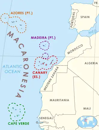 A nível biogeográfico há uma extensa faixa costeira do Noroeste da África, fronteira a esses grupos de ilhas, que se estende desde algumas áreas do Saara Ocidental (anexado por Marrocos) e da Mauritânia, a denominada região biológica do Deserto Costeiro Atlântico, parte extremo-ocidental do Saara, que tem algumas características em comum com a Macaronésia ao nível de flora (em pequenos enclaves isolados), mas que é mais frequentemente incluída, devido à maior parte da flora e fauna, na região Saaro-Arábica, e esta, muitas vezes é incluída na grande região ou Reino Paleártico, tal como a Macaronésia.