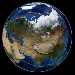 Em vermelho a Passagem do Nordeste que liga o Mar do Norte ao oceano Pacífico. |