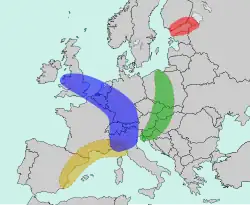 | Renana[10][12][13] | Europa ocidental, junto ao vale do rio Reno | ±33 mi hab. | Amsterdã, Dusseldórfia, Colônia, Bona e Estugarda | ||||||||