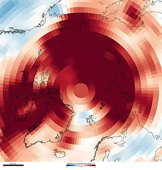 O período de 1995 a 2005 foi a década mais quente no Ártico desde, pelo menos, o século XVII, com temperaturas 2 °C acima da média de 1951 a 1990.[13] A temperatura do Alasca e do oeste do Canadá aumentou de 3 a 4 °C durante aquele período.[14] Uma pesquisa de 2013 mostrou que as temperaturas na região não têm sido tão altas quanto são atualmente desde pelo menos 44 000 anos atrás e talvez até 120 000 anos atrás.[15][16] Desde 2013, a temperatura média anual do ar na superfície (TAS) do Ártico tem sido pelo menos 1 °C mais quente do que a média de 1981-2010.