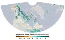 Entretanto, as florestas boreais, especialmente as da América do Norte, apresentaram uma resposta diferente ao aquecimento. Muitas florestas boreais ficaram mais verdes, mas a tendência não foi tão forte quanto a da tundra do Ártico circumpolar, caracterizada principalmente pela expansão dos arbustos e pelo aumento do crescimento.[88] Na América do Norte, algumas florestas boreais realmente ficaram marrons durante o período do estudo. Secas, aumento da atividade de incêndios florestais, comportamento animal, poluição industrial e vários outros fatores podem ter contribuído para o escurecimento.[79]