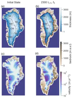 Todo verão, partes da superfície derretem e os penhascos de gelo caem no mar. Normalmente, o manto de gelo seria reabastecido pela queda de neve no inverno,[67] mas, devido ao aquecimento global, o manto de gelo está derretendo de duas a cinco vezes mais rápido do que antes de 1850,[68] e a queda de neve não tem acompanhado este ritmo desde 1996.[69] Se a meta do Acordo de Paris de ficar abaixo de 2 °C for alcançada, o derretimento do gelo da Groenlândia sozinho ainda acrescentaria cerca de 6 cm ao aumento do nível do mar global até o final do século. Se não houver reduções nas emissões, o derretimento acrescentaria cerca de 13 cm até 2100,[54]:1302 com o pior cenário de cerca de 33 cm.[70] Para fins de comparação, o derretimento contribuiu até agora com 1,4 cm desde 1972,[71] enquanto o aumento do nível do mar de todas as fontes foi de 15-25 cm entre 1901 e 2018.[72]:5