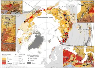 Em 2021, havia 1 162 assentamentos localizados diretamente sobre o permafrost do Ártico, que abrigam cerca de 5 milhões de pessoas. Até 2050, espera-se que a camada de permafrost abaixo de 42% desses assentamentos descongele, afetando todos os seus habitantes (atualmente 3,3 milhões de pessoas).[180] Consequentemente, uma ampla gama de infraestrutura em áreas de permafrost está ameaçada pelo degelo.[181][182]:236 Até 2050, estima-se que cerca de 70% da infraestrutura global localizada nas áreas de permafrost estaria sob alto risco de degelo do permafrost, incluindo 30-50% da infraestrutura “crítica”. Os custos associados poderiam chegar a dezenas de bilhões de dólares até a segunda metade do século.[183] Prevê-se que a redução das emissões de gases de efeito estufa, conforme o Acordo de Paris, estabilizará o risco após a metade do século; caso contrário, ele continuará a piorar.[184]