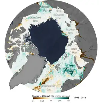 A redução do gelo marinho trouxe mais luz solar para o fitoplâncton e aumentou a produção primária marinha anual no Ártico em mais de 30% entre 1998 e 2020.[1]:2327 Como resultado, o Oceano Ártico se tornou um sumidouro de carbono mais forte durante esse período;[94] no entanto, ele ainda é responsável por apenas 5 a 14% do sumidouro total de carbono do oceano, embora se espere que desempenhe um papel maior no futuro.[95] Até 2100, espera-se que a biomassa de fitoplâncton no Oceano Ártico aumente em cerca de 20% em relação a 2000 no cenário de baixa emissão e em 30-40% no cenário de alta emissão.[1]:2329