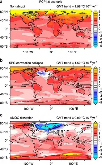- ↑ Liu, Wei; Xie, Shang-Ping; Liu, Zhengyu; Zhu, Jiang (6 de janeiro de 2017). «Overlooked possibility of a collapsed Atlantic Meridional Overturning Circulation in warming climate». Science Advances (em inglês). 3 (1). ISSN 2375-2548. PMC 5217057