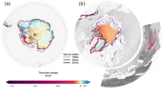 A região está em seu ponto mais quente em pelo menos 4 000 anos.[52] Além disso, a temporada de derretimento em todo o Ártico aumentou a uma taxa de cinco dias por década (de 1979 a 2013), dominada por um congelamento mais tardio no outono.[53] O Sexto Relatório de Avaliação do IPCC (2021) declarou que a área de gelo marinho do Ártico provavelmente cairá abaixo de 1 milhão de km2 em pelo menos alguns setembros antes de 2050.[54]:1249 Em setembro de 2020, o National Snow and Ice Data Center dos EUA informou que o gelo marinho do Ártico em 2020 havia derretido a uma extensão de 3,74 milhões de km2, sua segunda menor extensão desde que os registros começaram em 1979.[55] A Terra perdeu 28 trilhões de toneladas de gelo entre 1994 e 2017, sendo que o gelo marinho do Ártico foi responsável por 7,6 trilhões de toneladas desta perda. A taxa de perda de gelo aumentou 57% desde a década de 1990.[56]