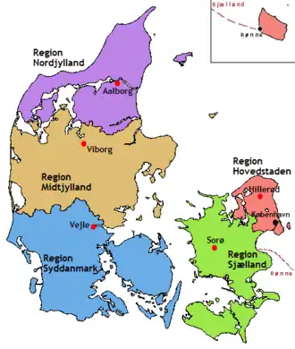 Pela Reforma Estrutural da Dinamarca - que começou a vigorar em 1 de janeiro de 2007 - os 13 antigos condados (amter) foram substituídos por 5 regiões (regioner), enquanto os 271 municípios (kommuner) foram fundidos em 98 novas comunas, mais abrangentes de pelo menos 20 mil habitantes, repartindo assim também a responsabilidade dos anteriores condados. [1]