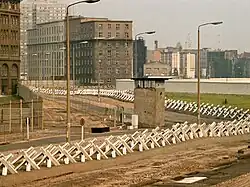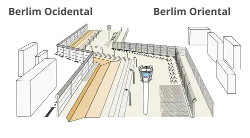 O Muro de Berlim tinha mais de 140 quilômetros de comprimento. Em junho de 1962, uma segunda cerca paralela, também conhecida como parede "hinterland" (muro interno),[42] foi construída cerca de 100 metros mais longe no território da Alemanha Oriental. As casas contidas entre a parede e as cercas foram destruídas e os moradores foram realocados, estabelecendo o que mais tarde ficou conhecido como "faixa da morte", que ficava coberta de areia ou cascalho, o que facilitava a detecção de pegadas e invasores e também permitia aos policiais ver quais guardas haviam negligenciado sua tarefa;[43] não oferecia cobertura; e, mais importante, oferecia campos de tiro claros para os guardas do muro.