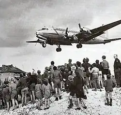 Em 1948, após desentendimentos sobre a reconstrução e uma nova moeda alemã, Stálin instituiu o Bloqueio de Berlim, impedindo que alimentos, materiais e suprimentos pudessem chegar a Berlim Ocidental.[20] Os Estados Unidos, Reino Unido, França, Canadá, Austrália, Nova Zelândia e vários outros países começaram uma enorme "ponte aérea de Berlim", fornecendo alimentos e outros suprimentos à Berlim Ocidental.[21] Os soviéticos montaram uma campanha de relações públicas contra a mudança da política Ocidental e socialistas tentaram perturbar as eleições de 1948,[22] enquanto 300 mil berlinenses pediam para que o transporte aéreo internacional continuasse.[23] Em maio de 1949, Stalin acabou com o bloqueio, permitindo a retomada dos embarques do Ocidente para Berlim.[24][25]