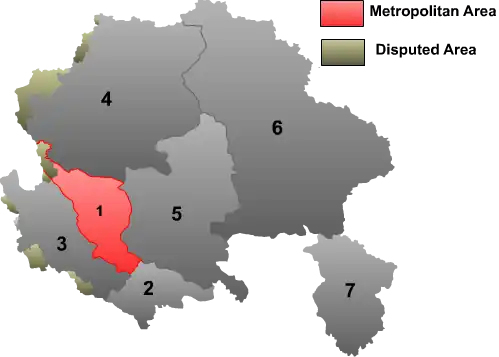 | # | Distrito | Hanzi | Hanyu Pinyin | Tibetano | Wylie | População (2010) | Área (km²) | Densidade (hab./km²) |