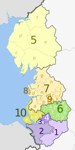 | 10. Merseyside * | a) Knowsley, b) Liverpool, c) St. Helens, d) Sefton, e) Wirral | ||