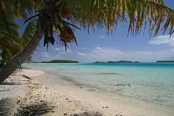 Praia de águas cristalinas no atol de Rangiroa, na Polinésia Francesa.