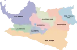 A área que agora constitui a Papua Central era originalmente composta por quatro regências: Mimika, Nabire, Paniai e Puncak Jaya. Duas novas regências foram criadas em 4 de janeiro de 2008: Dogiyai, a partir de parte da regência de Nabire, e Puncak, a partir de parte da regência de Puncak Jaya. Duas outras regências foram criadas em 29 de outubro de 2008: Deiyai e Intan Jaya, ambas a partir de partes da regência de Paniai. A nova província é composta por oito regências (e nenhuma cidade administrativa), listadas abaixo com suas áreas e suas populações nos Censos de 2010,[63] 2020[64] e de acordo com as estimativas oficiais de meados de 2023.[3] A tabela também inclui as capitais das regências e uma lista dos distritos (kecamatan) dentro de cada regência.