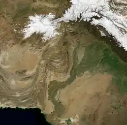 Cinco das montanhas do Paquistão ultrapassam os 8 000 m. O rio Indo corta o país de norte a sul, descendo do planalto tibetano (Caxemira) até desaguar no mar Arábico. A oeste do Indo estão os desertos secos e acidentados do Baluchistão; a leste, o deserto de Thar. O Panjabe e partes do Sinde são formados por planícies férteis com importante atividade agrícola.