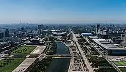 Panorama urbano do centro financeiro de Pequim Cidade Proibida Templo do Céu Grande Muralha Tiananmen Grande Salão do Povo (esquerda) e Grande Teatro Nacional (direita) | |