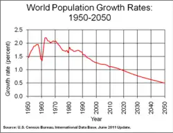 Segundo dados de 2015, prevê-se que a população mundial atinja os 8,5 mil milhões até 2030, contra os atuais 8 mil milhões, ultrapasse os 9 mil milhões de pessoas até 2050 e atinja os 11,2 mil milhões até ao ano 2100.[28] A maior parte do aumento ocorrerá em países em desenvolvimento, cuja população deverá aumentar de 5,6 mil milhões em 2009 para 7,9 mil milhões em 2050. Este aumento será distribuído entre a população de 15 a 59 anos (1,2 mil milhões) e de 60 anos ou mais (1,1 mil milhões), porque se prevê que o número de crianças menores de 15 anos nos países em desenvolvimento diminua. Em contrapartida, espera-se que a população das regiões mais desenvolvidas sofra apenas um ligeiro aumento de 1,23 mil milhões para 1,28 mil milhões, e que teria diminuído para 1,15 mil milhões, não fosse a migração líquida projetada dos países em desenvolvimento para os países desenvolvidos, que deverá atingir uma média de 2,4 milhões de pessoas anualmente entre 2009 e 2050.[29] As estimativas de longo prazo da população mundial em 2004 sugerem um pico por volta de 2070 de nove a dez mil milhões de pessoas, seguido de uma lenta diminuição para 8,4 mil milhões até 2100.[30]