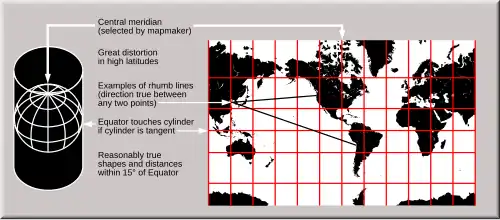 A projeção de Mercator é um tipo de projeção cilíndrica do globo terrestre. Nessa projeção, os meridianos são planificados na forma de linhas retas paralelas verticais que são horizontalmente equidistantes, ao passo que os paralelos são planificados na forma de linhas retas paralelas horizontais, de modo que a distância vertical entre dois paralelos sucessivos é tanto menor quanto mais próximos esses paralelos estiverem da linha do equador.