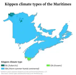 Apesar do nome, as províncias marítimas têm um clima continental úmido do subtipo que apresenta verões moderadamente quentes (Dfb, segundo a classificação climática de Köppen).[9][10][11] Especialmente na costa da Nova Escócia, as diferenças entre verões e invernos são estreitas em comparação com o resto do território canadense.[12] O clima no interior de Novo Brunswick está em forte contraste durante o inverno, lembrando áreas mais continentais.[9] Os verões são um tanto temperados pela influência marinha em todas as províncias, mas devido aos paralelos ao sul ainda permanecem semelhantes às áreas mais continentais mais a oeste. Yarmouth, na Nova Escócia, tem influência marinha significativa por ter um microclima oceânico (Cfb) limítrofe, mas as noites de inverno ainda são frias, mesmo em todas as áreas costeiras.[13] As áreas mais ao norte de Novo Brunswick estão logo acima da região de clima subártico (Dfc), com invernos continentais muito frios.[9]