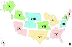 - Região VIII: Colorado, Montana, Dakota do Norte, Dakota do Sul, Utah e Wyoming