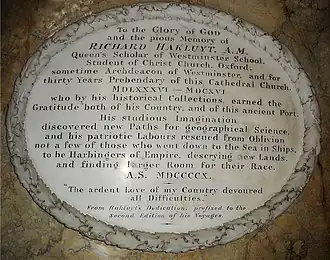 ![]() Hakluyt representado em vitral na janela oeste do transepto sul da Catedral de Bristol (obra de Charles Eamer Kempe, c. 1905). | |