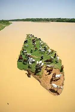 Animais pastando em uma ilha do rio Níger, como pode ser visto de uma ponte na capital do Níger, Niamei
