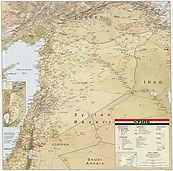 Síria (em árabe: سورية; romaniz.: Sūriyyaħ; ou سوريا; transl.: Sūriyā), oficialmente República Árabe Síria (em árabe: ٱلْجُمْهُورِيَّةُ ٱلْعَرَبِيَّةُ ٱلْسُوْرِيَّة; romaniz.: al-Jumhūriyya al-ʿArabiyya as-Sūriyya) é um país localizado na Ásia Ocidental. O território sírio de jure faz fronteira com o Líbano e o Mar Mediterrâneo a oeste; a Turquia ao norte; o Iraque a leste; a Jordânia ao sul e Israel ao sudoeste. Um país de planícies férteis, altas montanhas e desertos, é o lar de diversos grupos étnicos e religiosos, inclusive árabes, gregos, armênios, assírios, curdos, circassianos,[7] mandeus[8] e turcos. Os grupos religiosos incluem sunitas, cristãos, alauitas, drusos, mandeus e iazidis. Os árabes sunitas formam o maior grupo populacional do país.