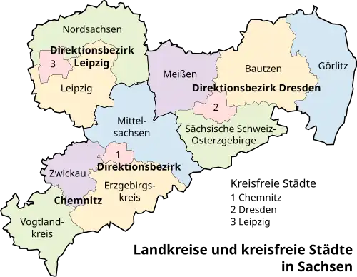 Os distritos e cidades independentes acima estavam agrupados em três regiões administrativas (Regierungsbezirke, singular Regierungsbezirk): Chemnitz (2), Dresda (1) e Leipzig (3).