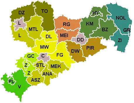 Desde 1 de agosto de 2008, após a reforma distrital ocorrida no estado, a Saxônia está dividida em três regiões (Direktionsbezirke) — Chemnitz, Dresden (Dresda), Leipzig (Lípsia) — que estão subdivididas em 10 distritos (Kreise, singular Kreis; ou ainda distritos rurais: Landkreise, singular Landkreis) e três cidades independentes (Kreisfreie Städte; ou ainda distritos urbanos: Stadtkreise, singular Stadtkreis), que possuem estatuto de distrito.