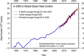 Os mares absorveram mais de 90% do calor acumulado na Terra nas últimas décadas, e isso tem impedido que o aquecimento atmosférico fosse ainda maior do que o observado. O calor tem ficado estocado principalmente na camada superficial, que vai até 700 metros de profundidade, mas as camadas mais profundas já dão mostras de algum aquecimento. A distribuição do calor entre as camadas de água depende de diversas variáveis, como o comportamento das correntes marinhas e a variação na salinidade, que também são afetadas pelo aquecimento, criando uma rede intrincada de causas e efeitos em cascata que torna difícil a previsão exata da elevação futura.[1]