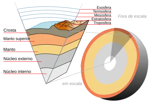 ![]() Corte do interior da Terra, do núcleo para a exosfera. Não está à escala. |