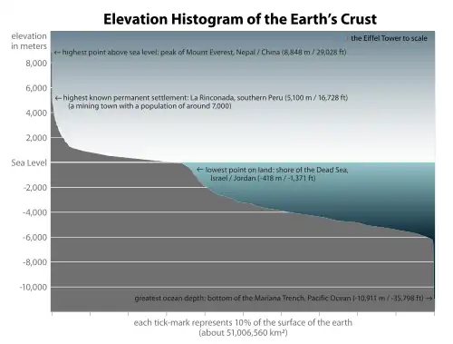 A topografia local desvia-se deste esferoide idealizado ainda que, numa escala global, estes desvios sejam muito pequenos: a Terra tem uma tolerância de cerca de uma parte em 584, ou 0,17%, do esferoide de referência, o que é menor que a tolerância de 0,22% permitida nas bolas de bilhar.[75] Os maiores desvios locais na superfície rochosa da Terra são o Monte Everest (8 848 m acima do nível do mar) e a Fossa das Marianas (10 984 m abaixo do nível do mar).[76] Devido à saliência equatorial, os locais da superfície mais afastados do centro da Terra são os cumes do Chimborazo no Equador e de Huascarán no Peru.[77][78][79]