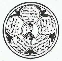 - O bispo Isidoro de Sevilha (560–636) ensinou em sua enciclopédia amplamente lida, as Etimologias, diversas concepções, como que a Terra "se assemelha a uma roda", parecida com a linguagem de Anaximandro no mapa que ele forneceu.[102] Isso foi amplamente interpretado como se referindo a uma Terra plana em forma de disco.[103][104] Uma ilustração do De Natura Rerun, de Isidoro mostra as cinco zonas da Terra como círculos adjacentes. Alguns concluíram que ele achava que as zonas árticas e antárticas eram adjacentes entre si.[105] Ele não admitiu a possibilidade de antípodas, em que considerava que as pessoas habitam no lado oposto da Terra, considerando-os lendários[106] e observando que não havia evidência de sua existência.[107] O mapa de T e O de Isidoro, que foi concebido representando uma pequena parte de uma Terra esférica, continuou a ser usado pelos autores durante a Idade Média, por exemplo, o bispo do século IX, Rábano Mauro, que comparou a parte habitável do hemisfério norte (clima temperado do norte) com uma roda. Ao mesmo tempo, as obras de Isidoro também mostraram as mesmas noções, e.g. no capítulo 28 em De Natura Rerum, Isidoro afirma que o sol orbita a terra e ilumina o outro lado quando é noite neste.[108] Em seu outro trabalho Etimologias, há também afirmações de que a esfera celeste tem a terra no centro e o céu distante de todos os lados.[109][110] Outros pesquisadores também discutiram esses pontos.[97][111][112] "O trabalho permaneceu insuperável até o século XIII e foi considerado o topo de todo o conhecimento. Tornou-se uma parte essencial da cultura medieval europeia. Logo após a invenção da tipografia apareceu muitas vezes na impressão".[113] No entanto, "os escolásticos — depois filósofos, teólogos e cientistas da época — foram ajudados pelos tradutores e comentaristas árabes, mas eles dificilmente precisavam lutar contra um legado da terra plana desde a Idade Média (500–1050). Os primeiros escritores medievais muitas vezes tinham impressões confusas e imprecisas de Ptolomeu e Aristóteles e dependiam mais de Plínio, contudo sentiram (com uma exceção), pouca vontade de assumir a planicidade".[97]
